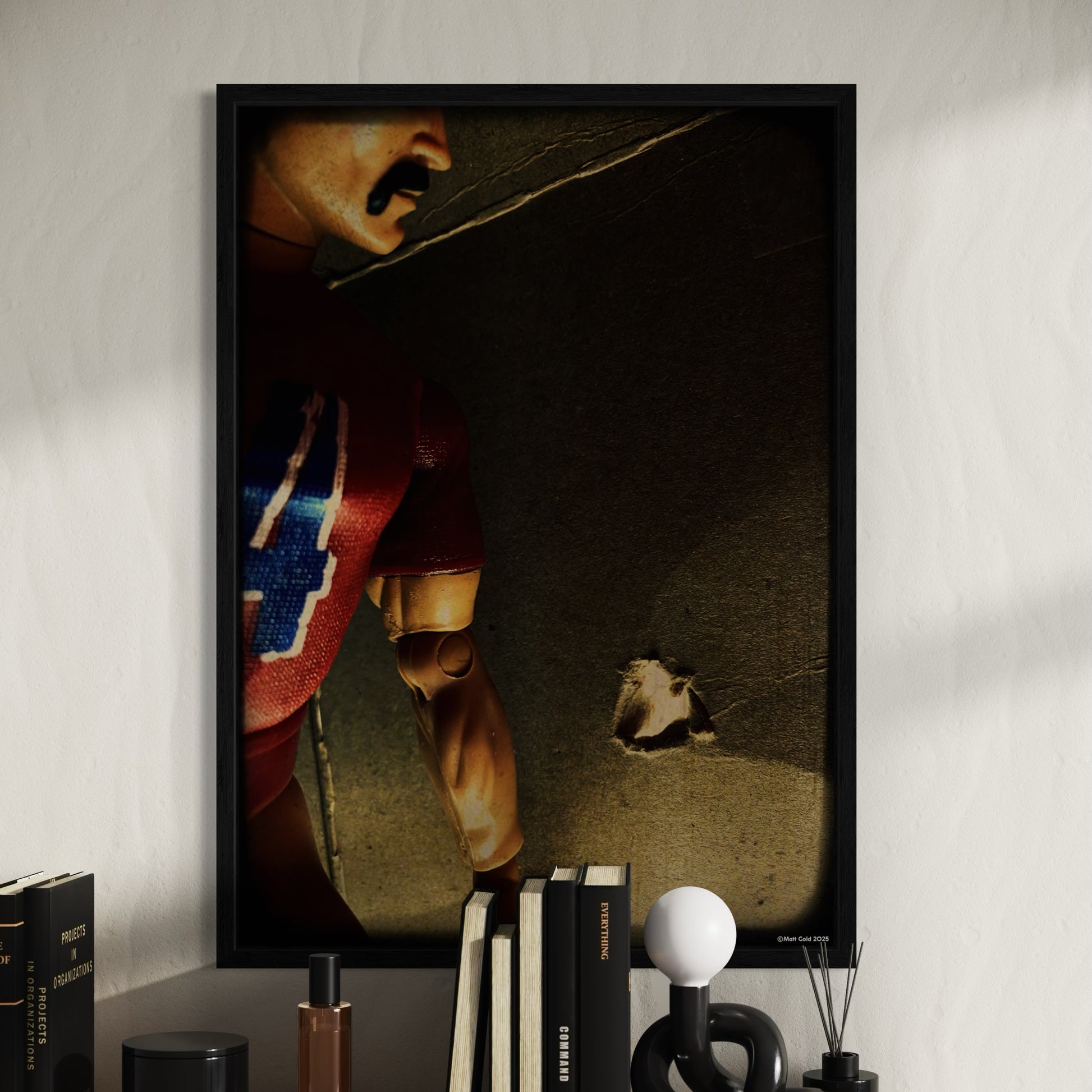 Cruising (2023) from Gold's Midnight Dolls series, explores the coded connections of gay underground subculture using vintage Gl Joe dolls. This mixed media photograph is a mysterious, quiet nod to the hidden language of queer desire and exploration.