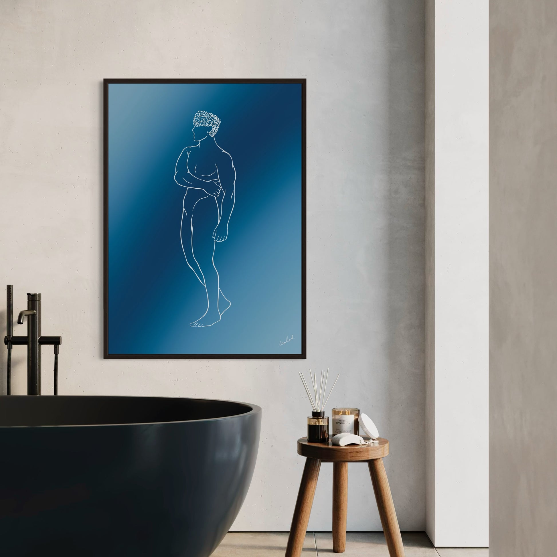 “You Were Blue” is one of two artworks created as a pair. On its own, the piece reflects the anxiety and uncertainty that can come with love. The figure caresses his own body in an act of comfort, embodying both protection and vulnerability. It represents one of the hidden sides of love; the unknown, but also it represents the feeling of having butterflies in your stomach.